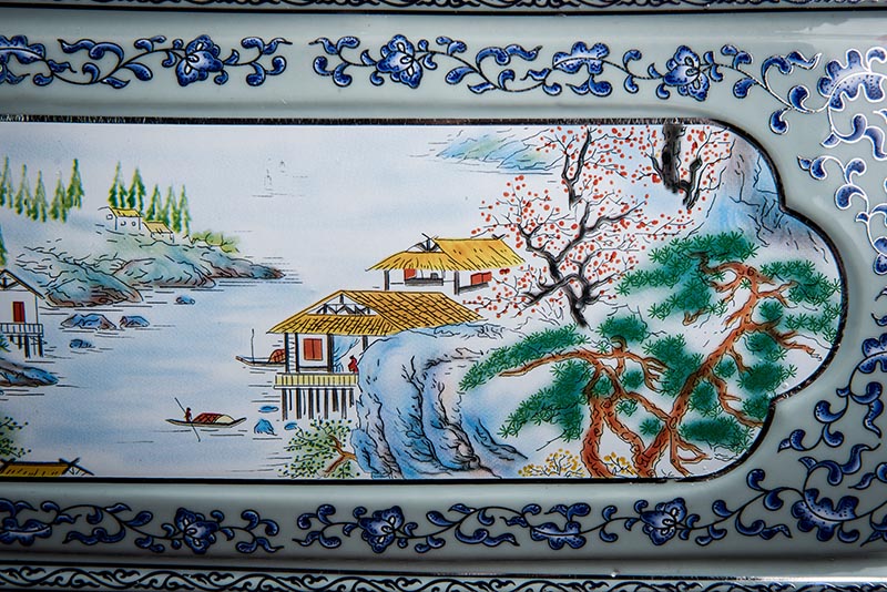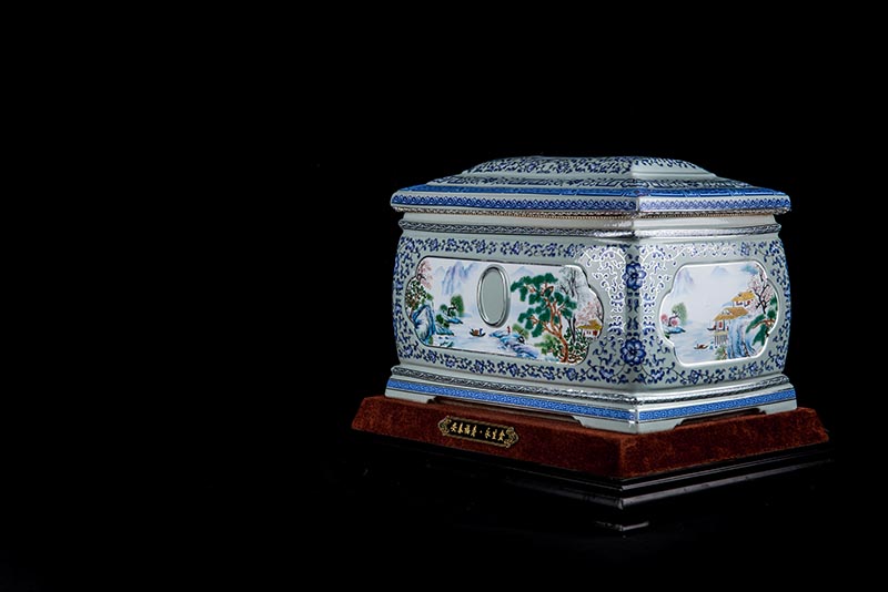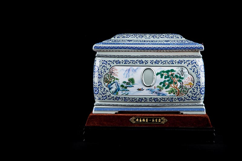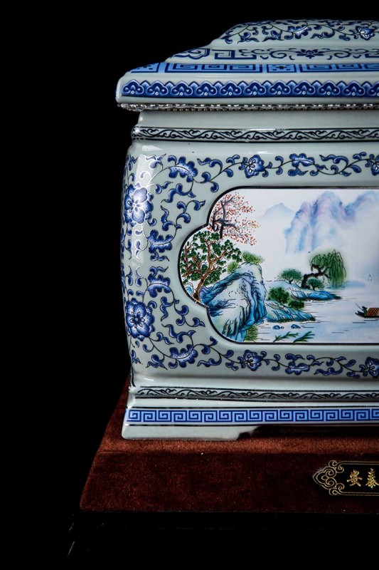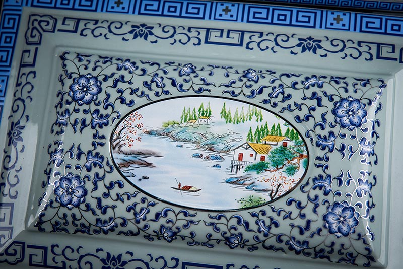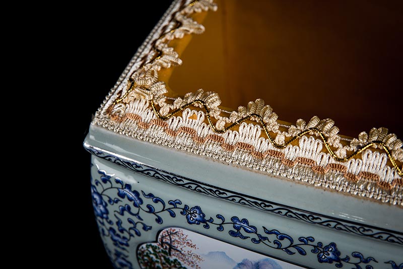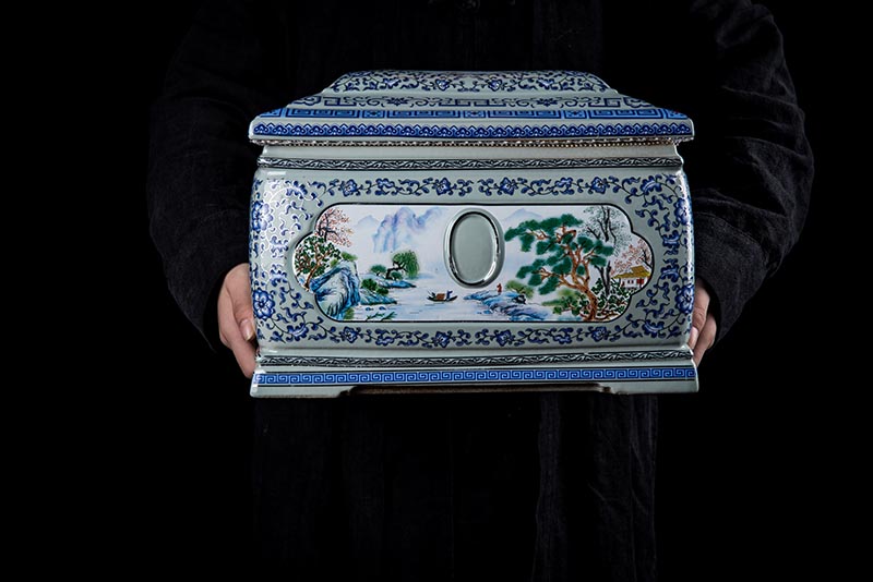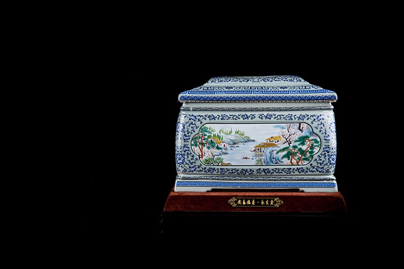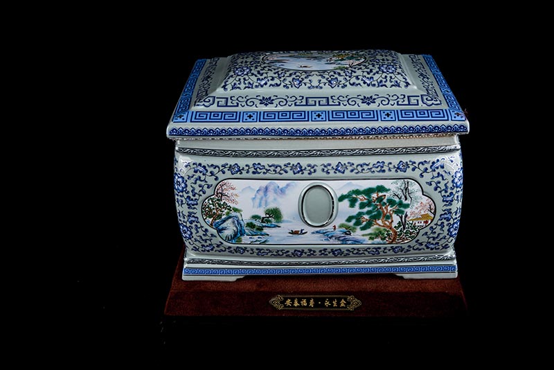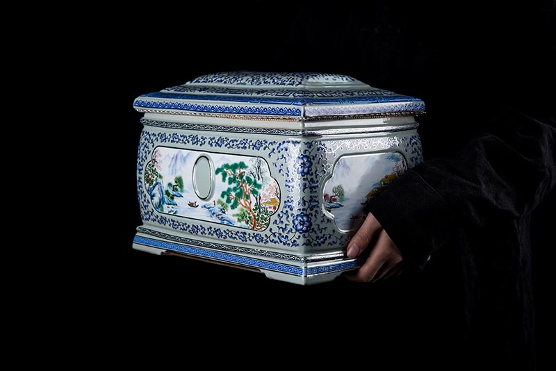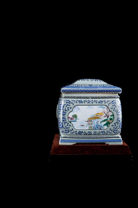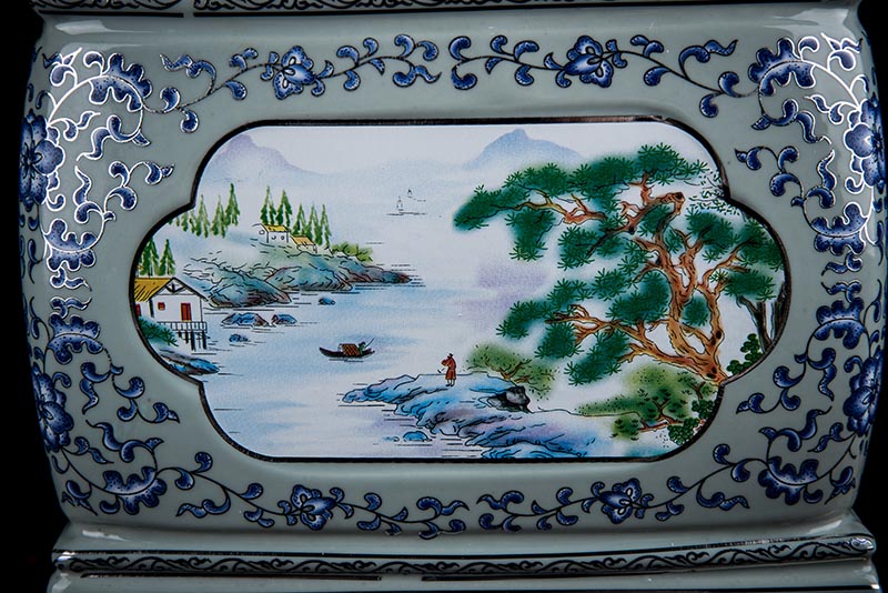 這款產(chǎn)品采用了青花粉彩工藝,既有景德鎮(zhèn)具特色的青花,又有山水,景德鎮(zhèn)民間稱之為“開窗山水”很多工藝品都會運用上,讓許多文人墨客忍不住注目觀看。我們可以看到這款產(chǎn)品圖片上青花與山水搭配巧妙,纏枝蓮紋環(huán)環(huán)相扣,寓意后世枝繁葉茂,代代繁榮。尺寸:340x230x250mm